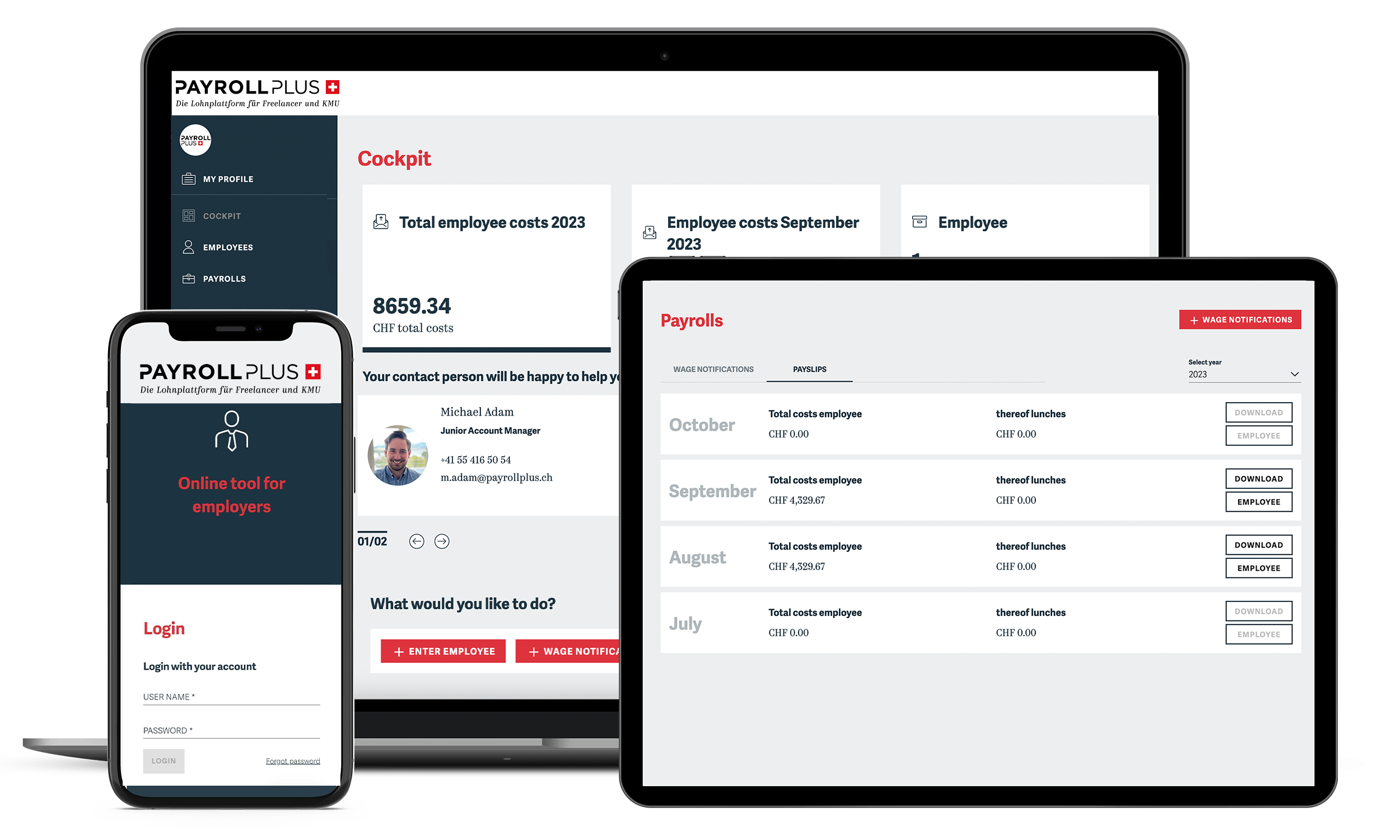 Those who process salaries through our payroll platform benefit from the Salary Package: insurance coverage (UVG, KTG, BVG), salary payments, and AHV (OASI) contributions – everything is included.