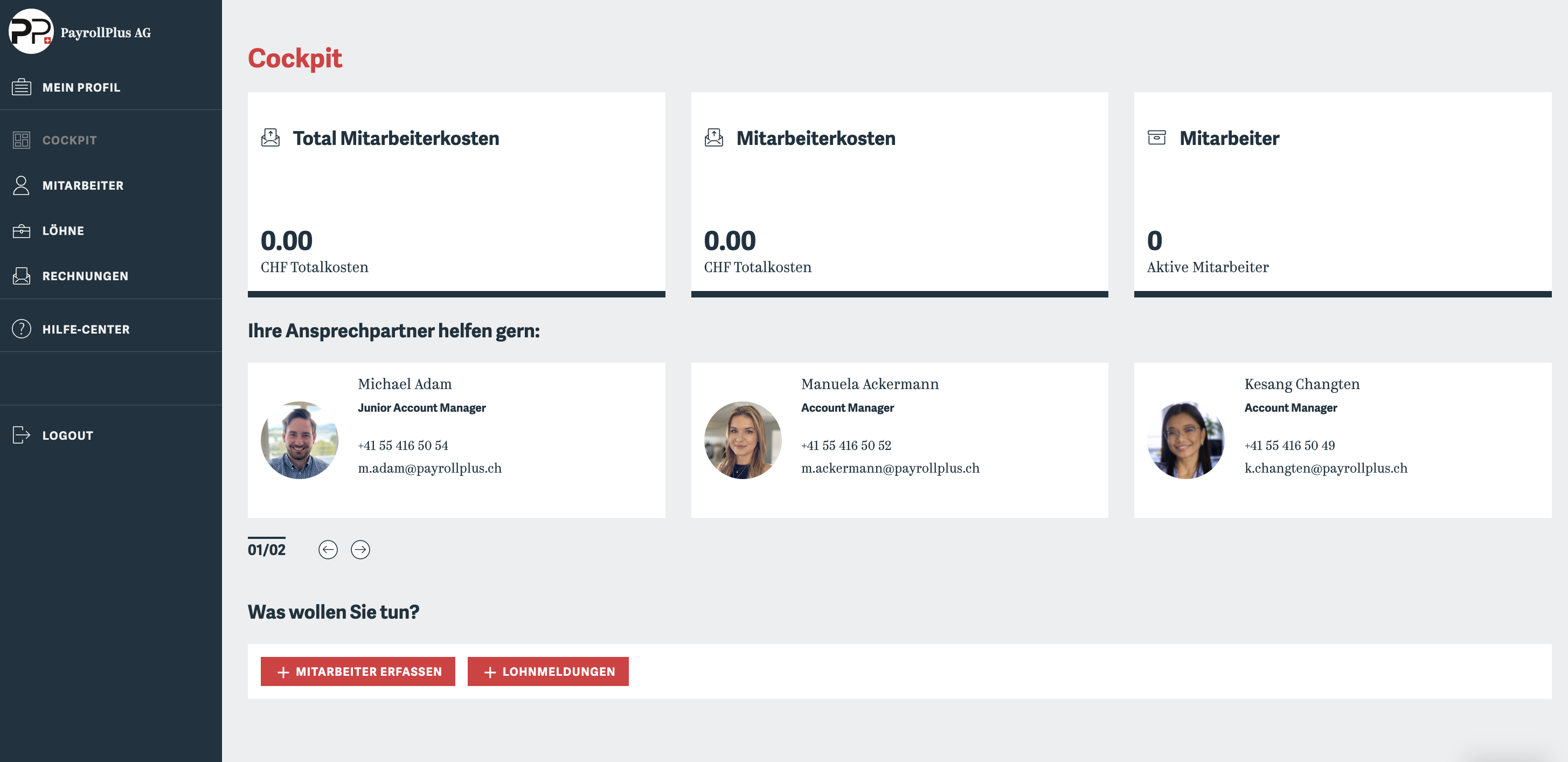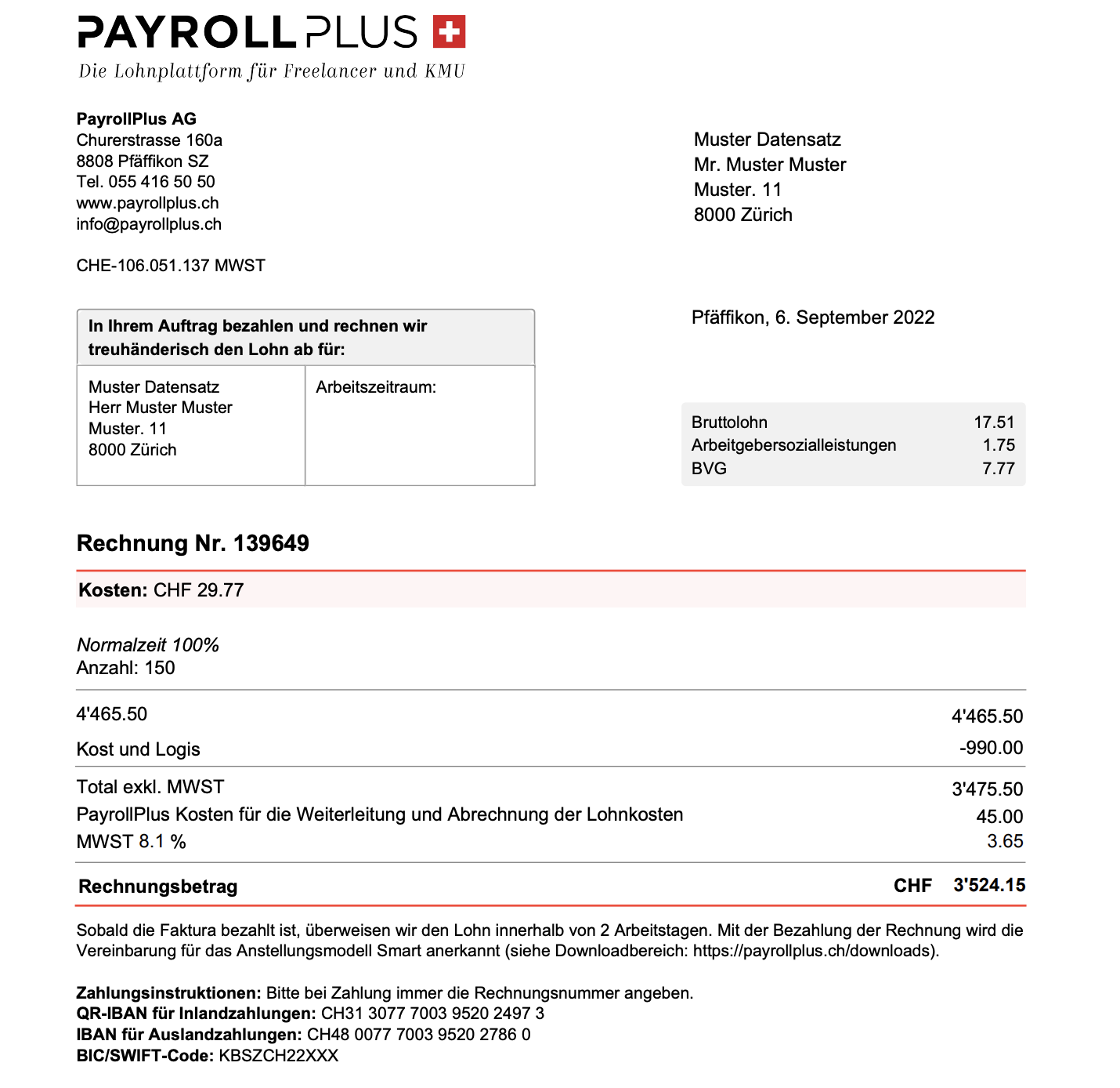 Sie erhalten die Rechnung per E-Mail und im Onlinetool. Auf der Rechnung ist die Hochrechnung vom Bruttolohn auf den Rechnungsbetrag inklusive der berücksichtigten Sozialbeiträge ersichtlich. Nach Bezahlung der Rechnung verarbeitet, versichert und bezahlt PayrollPlus den Lohn Ihrer Mitarbeitenden.