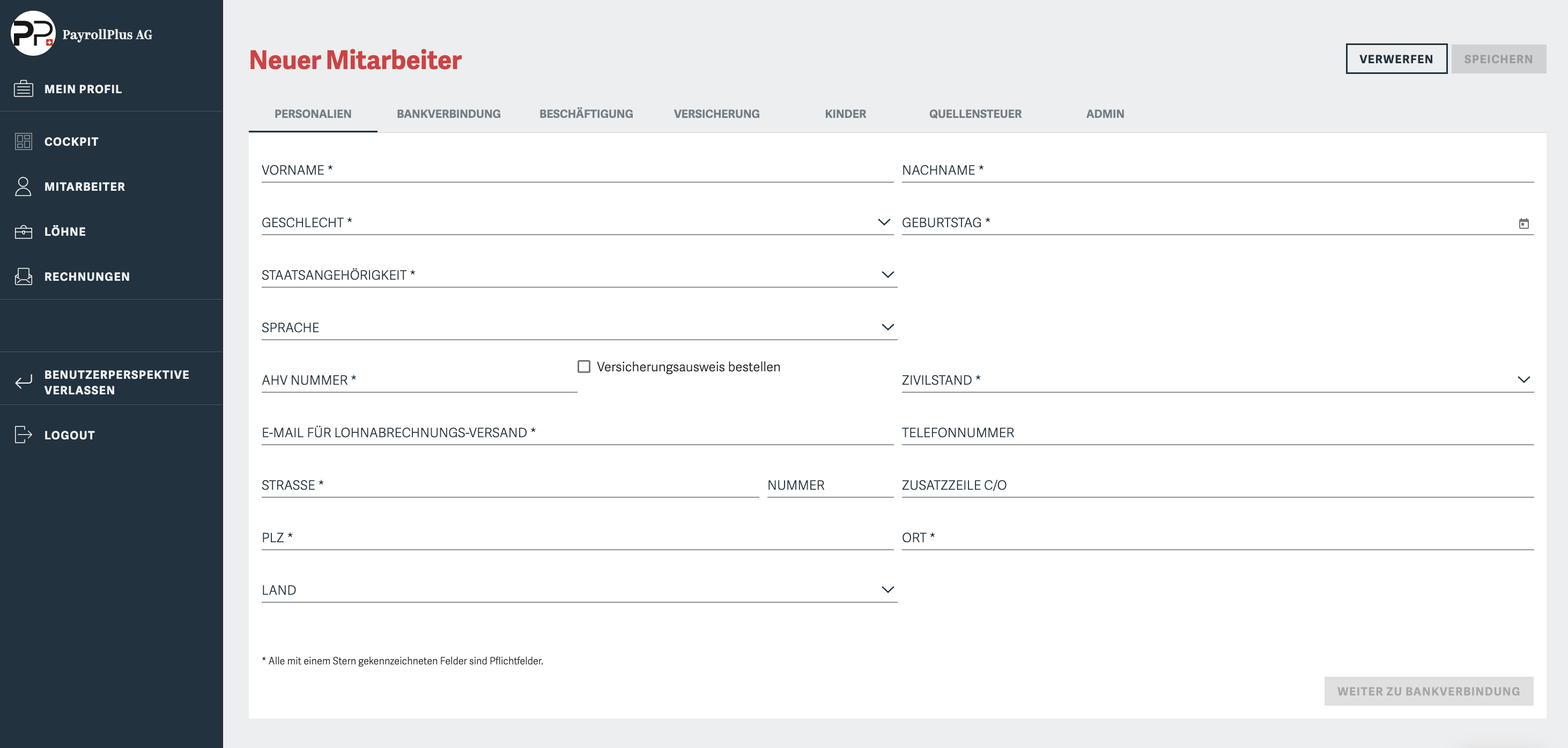 Geben Sie die Personalien, Bankverbindung, Beschäftigungsart und Versicherungsdaten Ihrer Mitarbeitenden ein.
