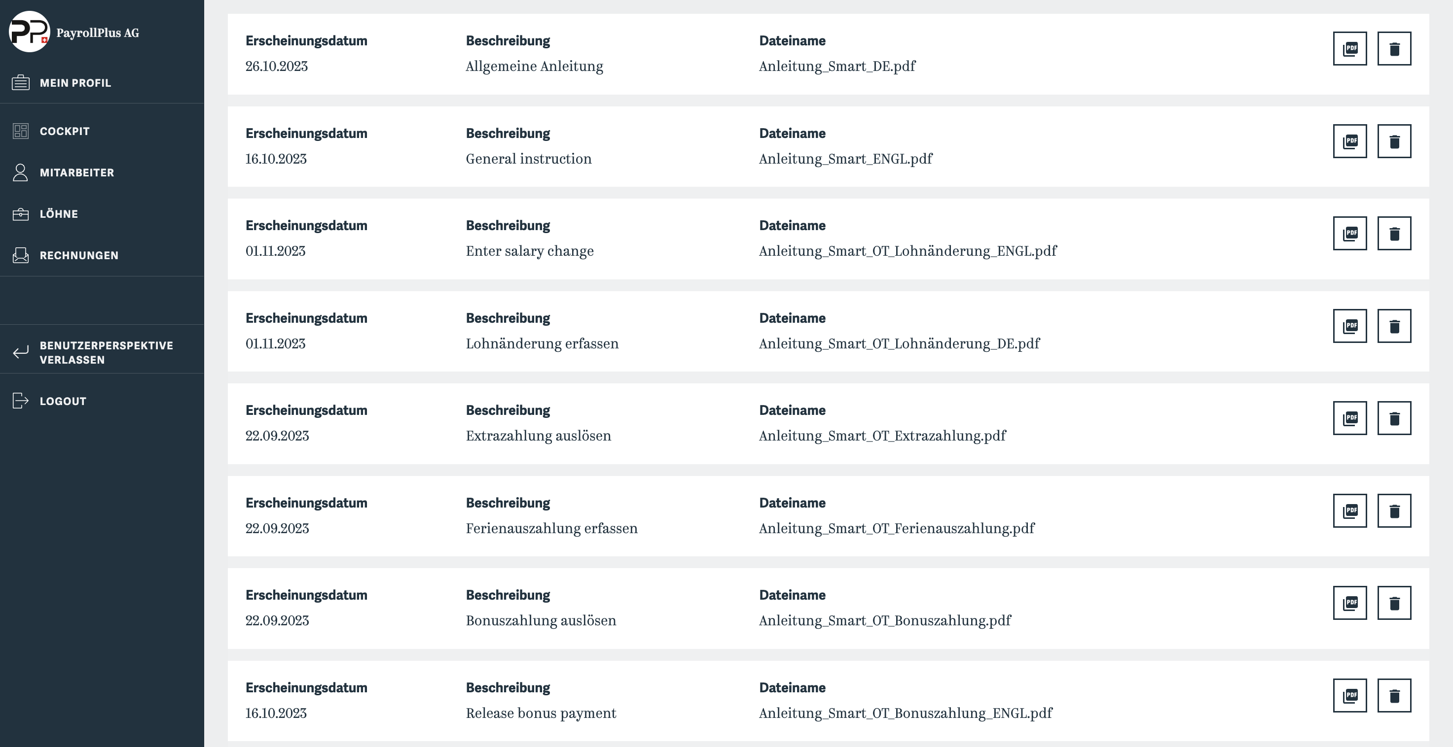 Nach jeder Lohnzahlung erhält der Mitarbeitende die Lohnabrechnung automatisch per E-Mail oder kann sie im Mitarbeiterportal herunterladen. Als Kunde behalten Sie jederzeit den Überblick über alle ausbezahlten Löhne und können diese bei Bedarf herunterladen.
