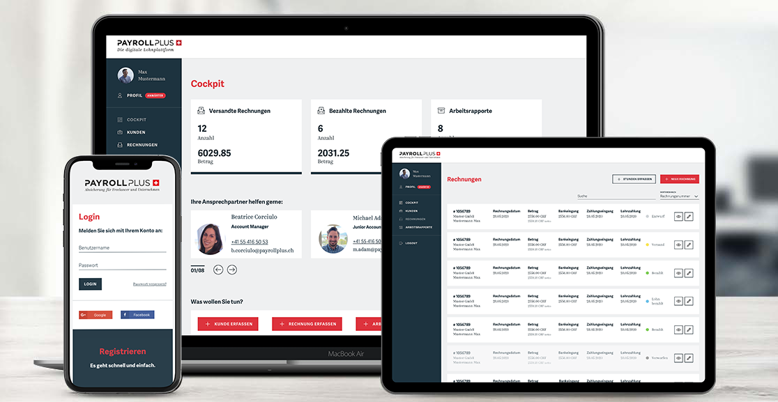 Nous ne sommes pas seulement un logiciel de paie ou une fiduciaire : PayrollPlus offre le pack salaire complet. Nous calculons et payons les cotisations AVS, les allocations familiales et l’impôt à la source, tandis que les freelancers profitent de nos assurances (LAA, IJM, LPP).
